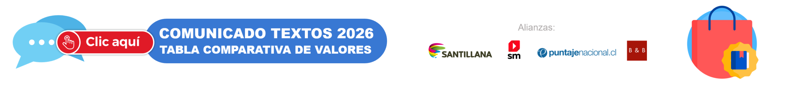 Además indicar que hemos concretado una alianza con las editoriales Santillana, SM, Puntaje Nacional y Books & Bits, para que la venta de los textos escolares 2026 se efectúe en las oficinas de administración de nuestro Colegio desde el 19 de enero de 08:30 a 13:00 hrs.